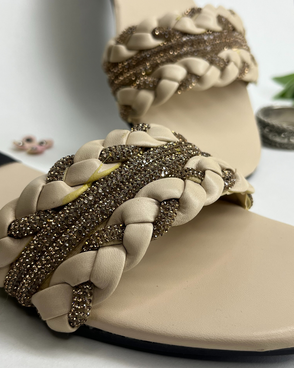 Step into effortless elegance with our Braided Elegance Crystal Flats in Beige. Designed with a luxuriously soft footbed and a double braided strap embellished with premium crystals, these flats blend comfort and glamour perfectly. The neutral beige tone makes it ideal for everyday wear, festive outfits, and semi-formal occasions. Lightweight, stylish, and versatile — a must-have addition to your wardrobe.