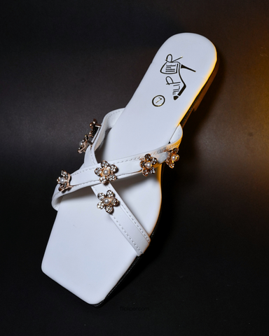 Elevate your style with these White Pearl-Flower Cross Strap Flats, crafted with premium soft material and beautifully embellished floral stones.